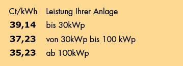 Damit sich Ihre Investition sicher langfristig lohnt, hat der deutsche Gesetzgerber das Erneuerbare Energien Gesetz (EEG) geschaffen. Das garantiert Ihnen für jede kWh Strom die aus Sonnenlicht gewonnen wird und die in das öffentliche Netz eingespeist wird, einen festen Preis je nach Leistung Ihrer Anlage - und das für die nächsten 20 Jahre.